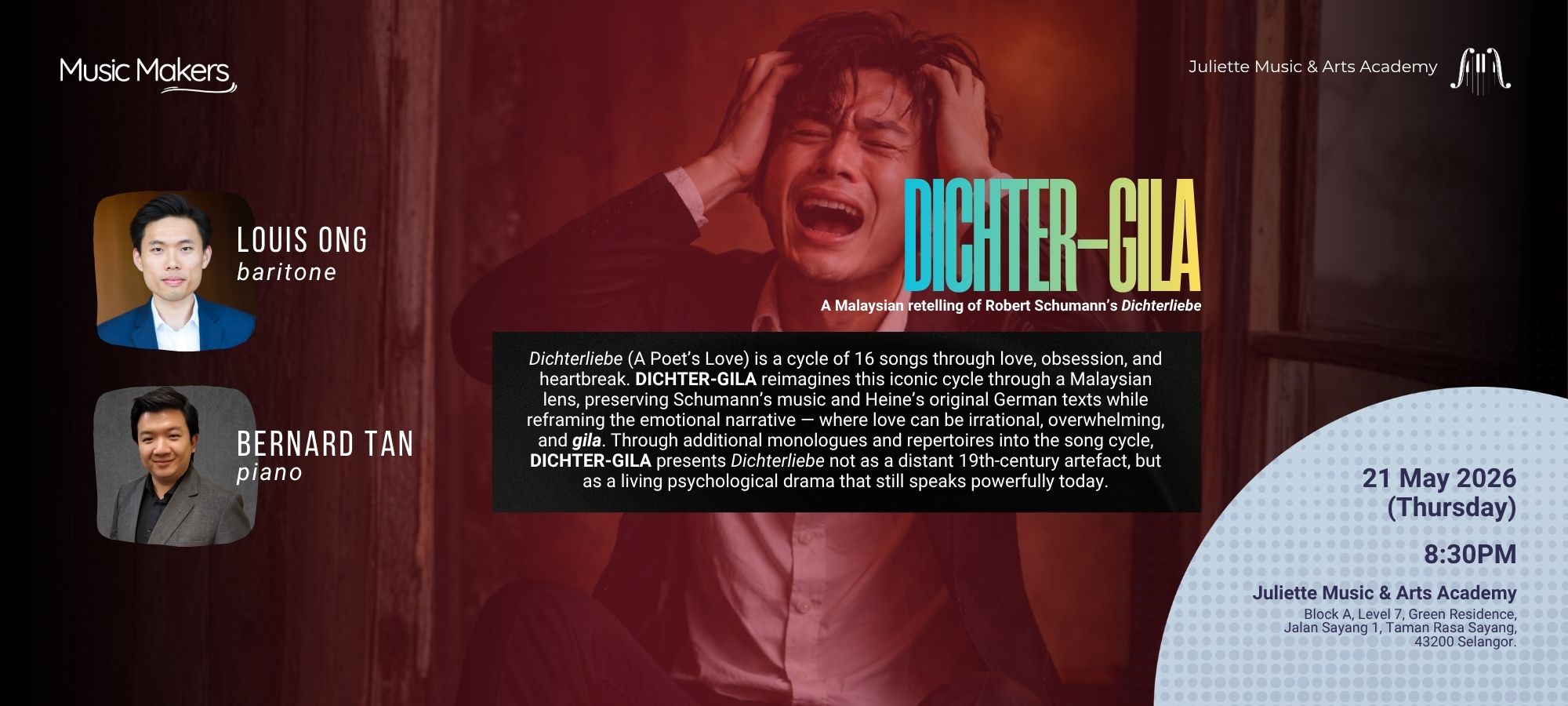 Dichterliebe (A Poet’s Love) is a cycle of 16 songs through love, obsession, and heartbreak. Dichter-Gila reimagines this iconic cycle through a Malaysian lens, preserving Schumann’s music and Heine’s original German texts while reframing the emotional narrative — where love can be irrational, overwhelming, and gila. Through additional monologues and repertoires into the song cycle, Dichter-Gila presents Dichterliebe not as a distant 19th-century artefact, but as a living psychological drama that still speaks powerfully today.