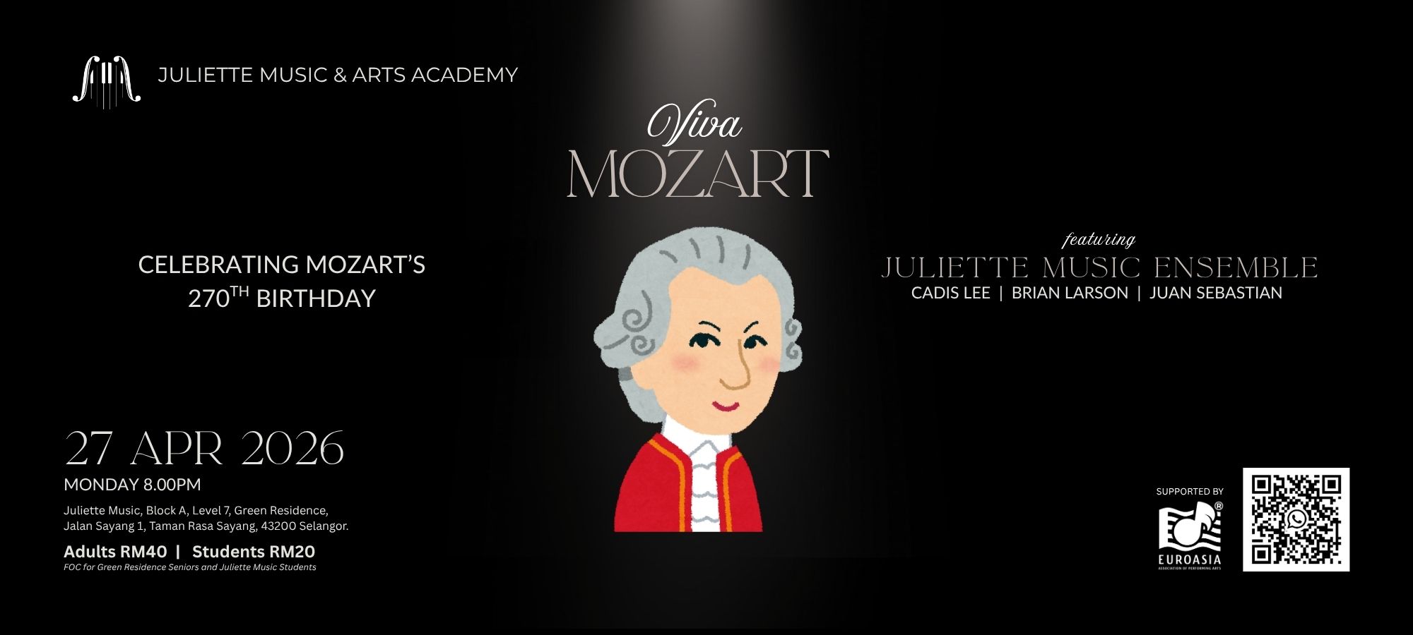 This intimate evening brings together outstanding musicians in a programme that showcases Mozart’s refined chamber textures and lyrical dialogue, from the warm intimacy of the Kegelstatt Trio to the vibrant interplay of the Sinfonia Concertante. Join us for a night of classical beauty, clarity, and joy at Juliette Music & Arts Academy. 🎶